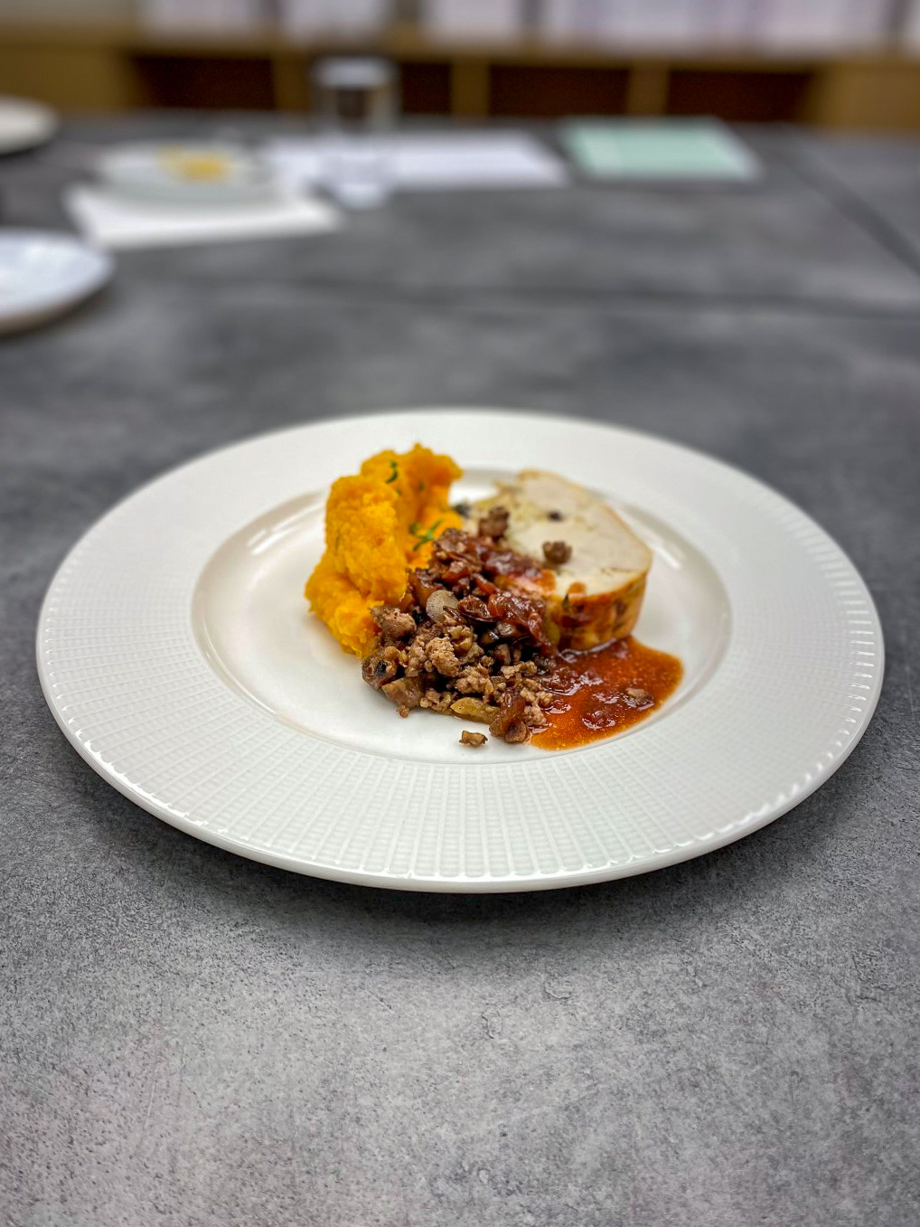 Ρολό γαλοπούλας με σάλτσα μούρων, με κιμά, κάστανα & πουρέ γλυκοπατάτας