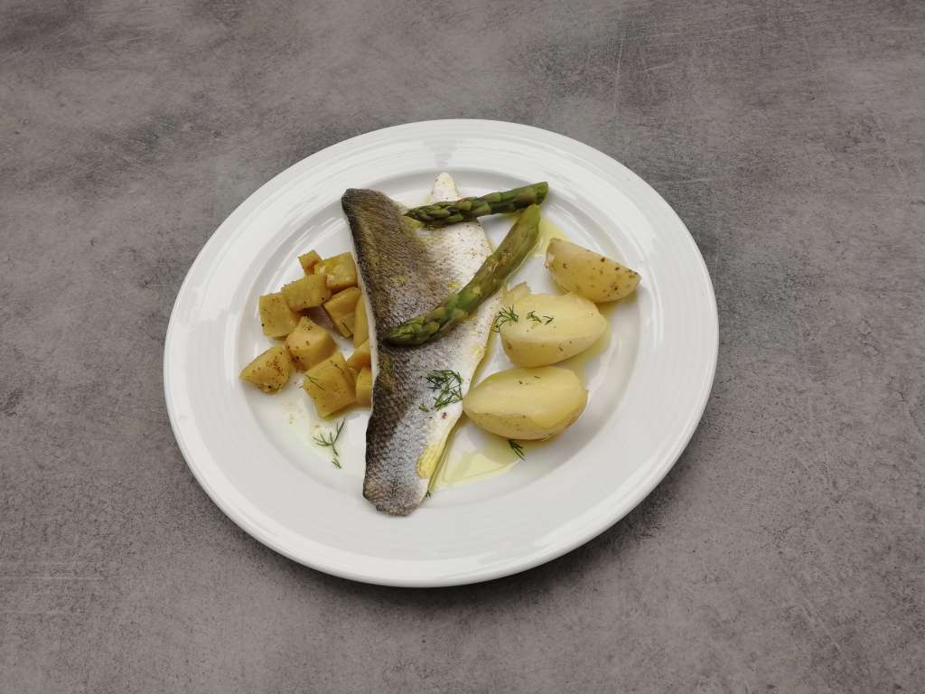 Λαβράκι με κίτρινη σελινόριζα, σπαράγγια & πατάτες ατμού