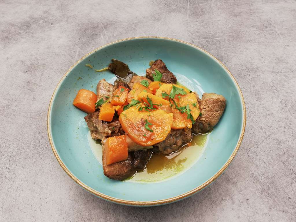 Μοσχαράκι λεμονάτο στο φούρνο με καρότα γλυκοπατάτες & σελινόριζα