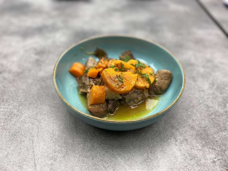 Μοσχαράκι λεμονάτο στο φούρνο με καρότα γλυκοπατάτες & σελινόριζα