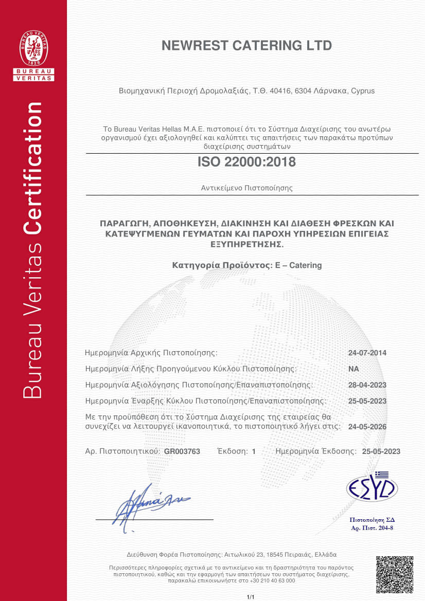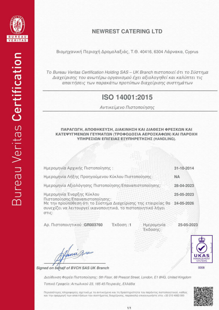 Η Newrest Κύπρου έχει αναπτύξει και εφαρμόζει σύστημα για τη διαχείριση της ποιότητας, της ασφάλειας των τροφίμων, της υγείας και ασφάλειας στην εργασία καθώς και σύστημα περιβαλλοντικής διαχείρισης. Τα συστήματα διαχείρισης ποιότητας και ασφάλειας τροφίμων έχουν πιστοποιηθεί σύμφωνα με τα διεθνή πρότυπα ISO 9001:2015 και ISO 22000:2018. Επιπλέον το σύστημα περιβαλλοντικής διαχείρισης που εφαρμόζει η εταιρεία έχει πιστοποιηθεί σύμφωνα με τις απαιτήσεις του διεθνούς προτύπου ISO 14001:2015. Τέλος, τον Μάιο του 2023 η εταιρεία πιστοποιήθηκε για την εφαρμογή του συστήματος διαχείρισης υγείας και ασφάλειας στην εργασία σύμφωνα με το διεθνές πρότυπο ISO 45001:2018.