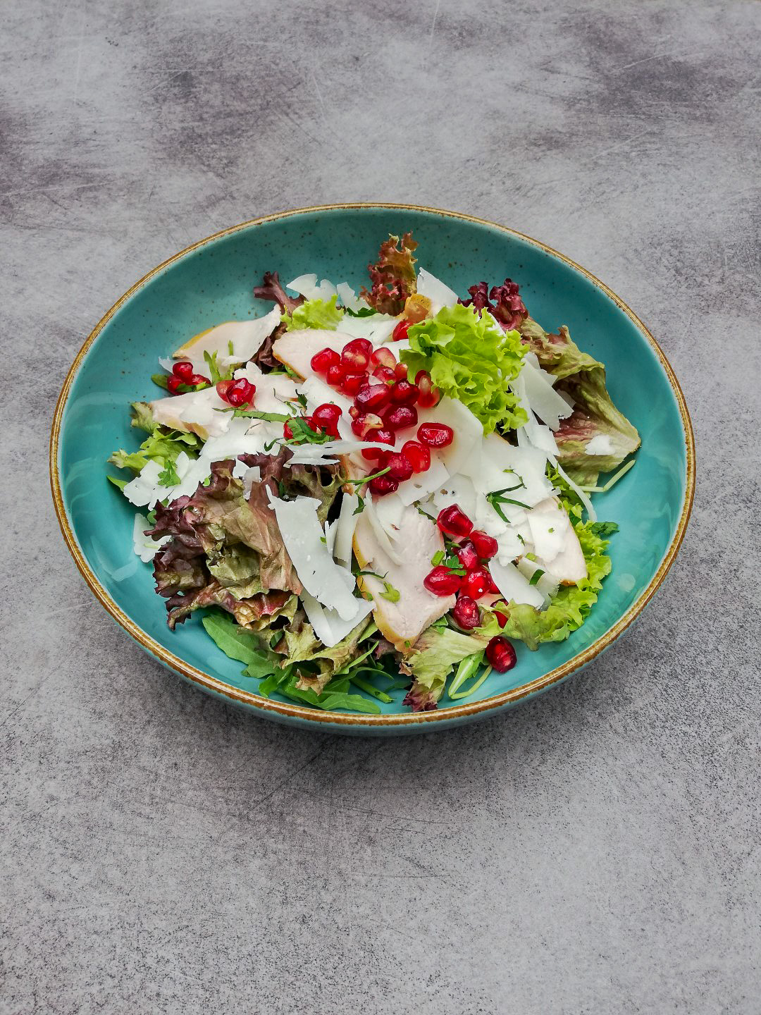 Mixed salad with pear, gruyere & pomegranate sauce