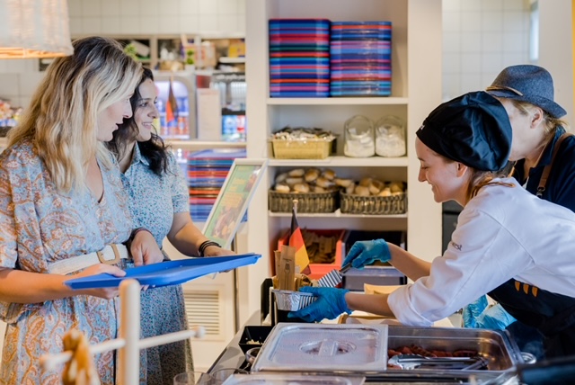 The theme day’s menu included show cooking with delicious recipes met on the streets of the city during the festival every October, such as Currywurst, German sausages with spicy sauce and curry, and Kartoffelpuffer, crispy potato croquettes with grated onion and spices. Of course, hot pretzels and cold alcohol free beers could not be missing from the proposals of the day, completing the menu pleasure. The meal ended with sweet temptations of praline and strawberry berlines.