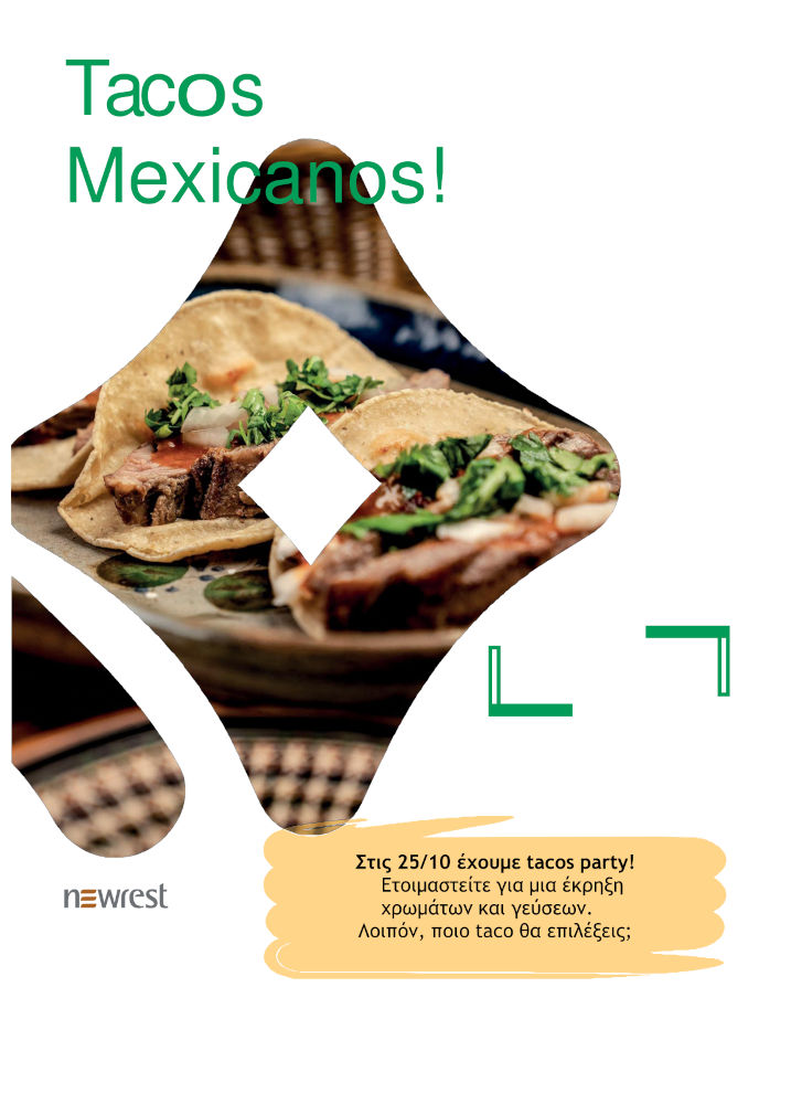Of course, we did not stop there…wanting to give a more festive character with international flavors, we organized an imaginary tasty trip to Mexico, offering the ultimate street food…delicious tacos with chicken, vegetables and spicy sauces made their debut and became rapturous!